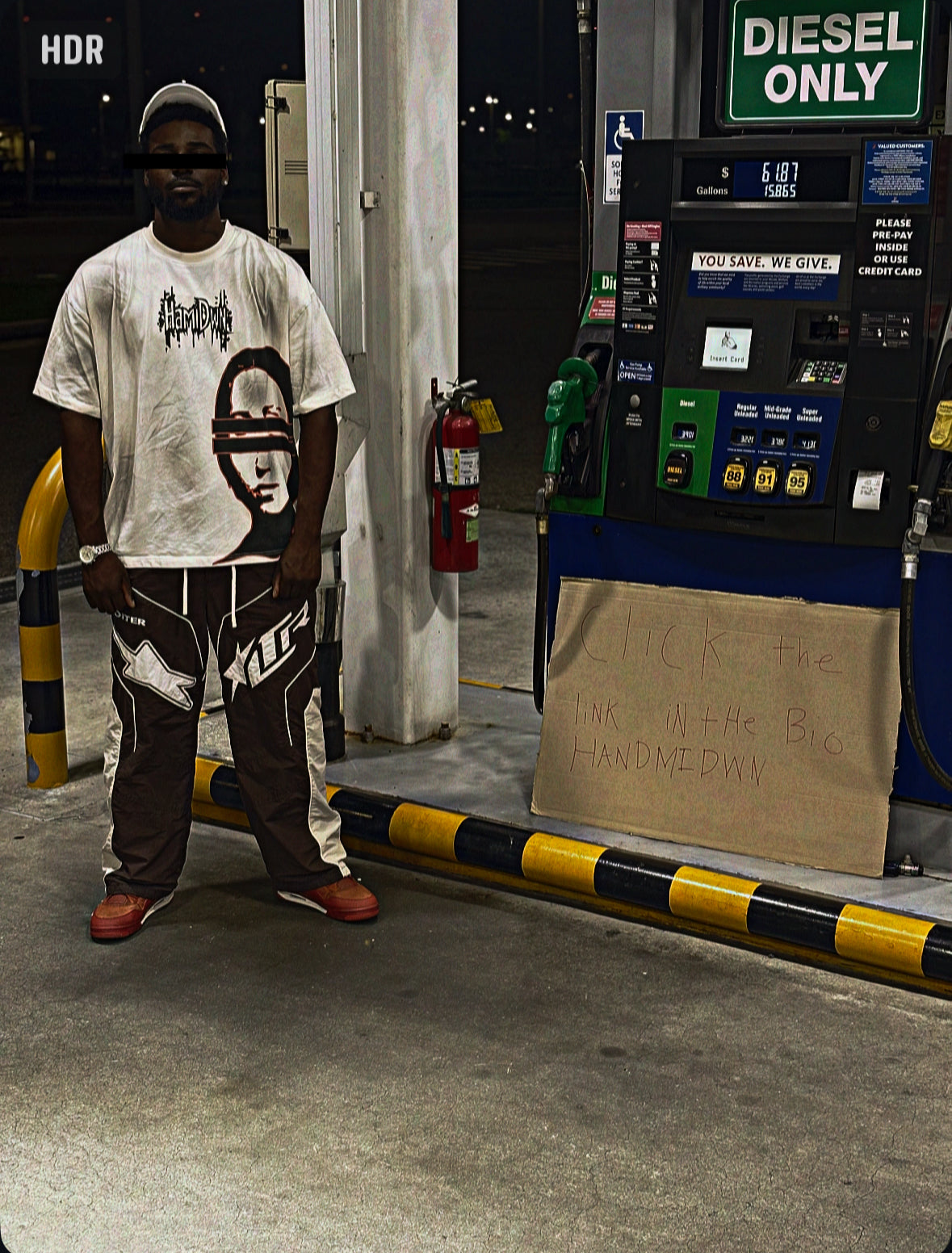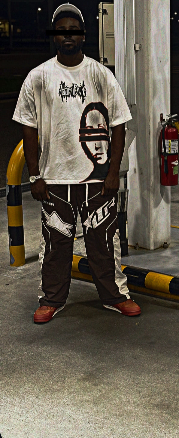 oversized monochrome face graphic with distorted double eyes and scattered red splatter accents